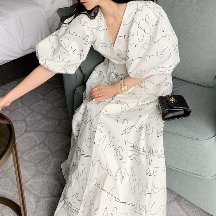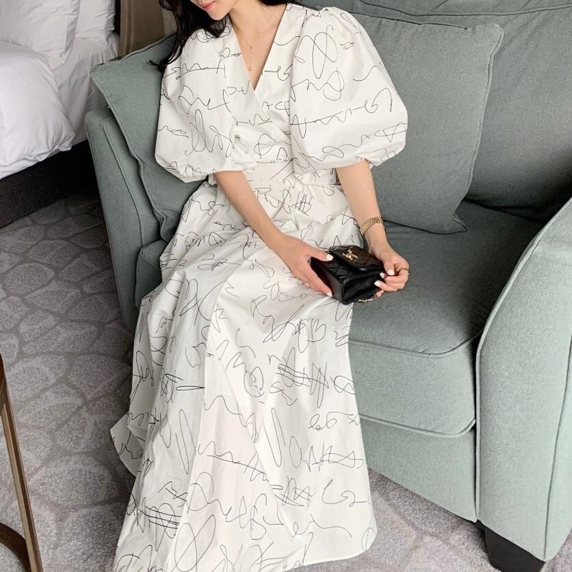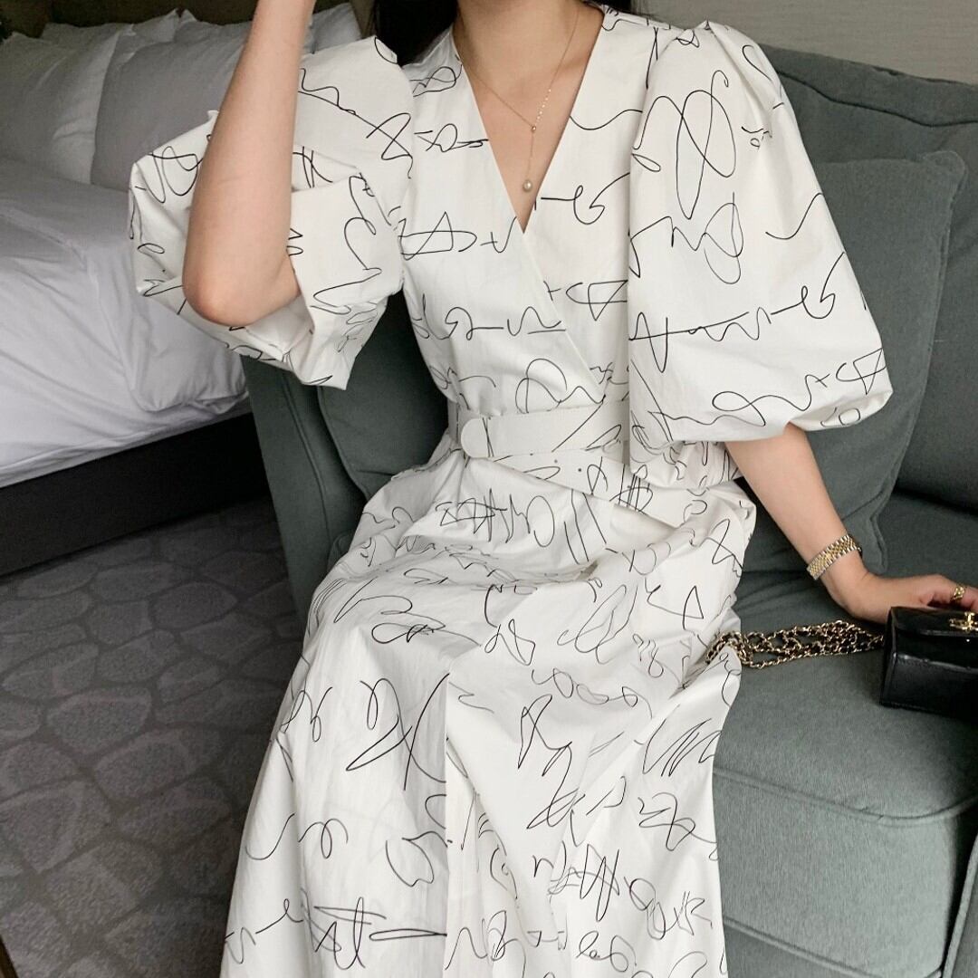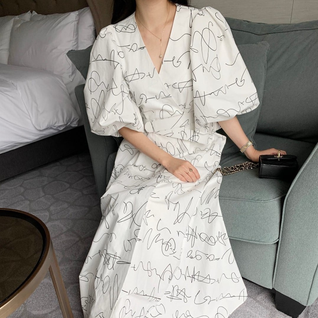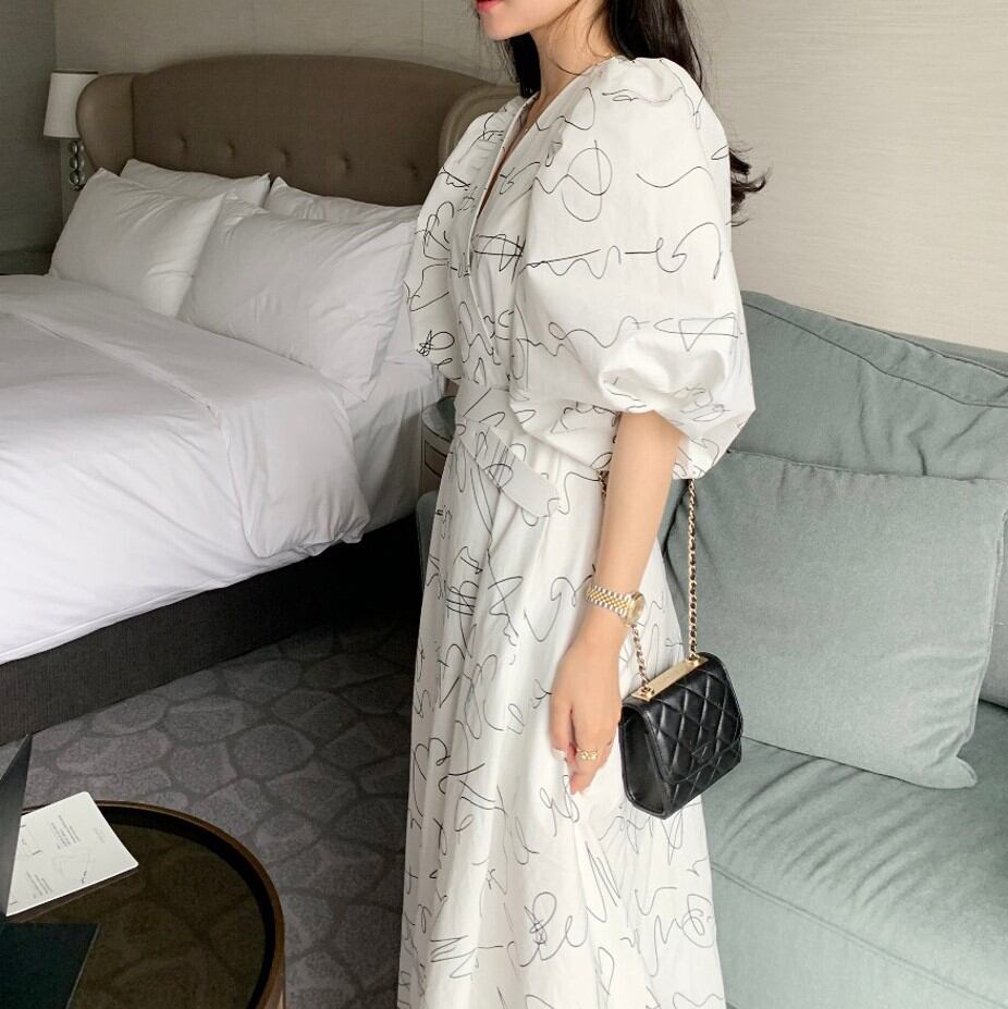 Vネックランタンスリーブワンピース 00294