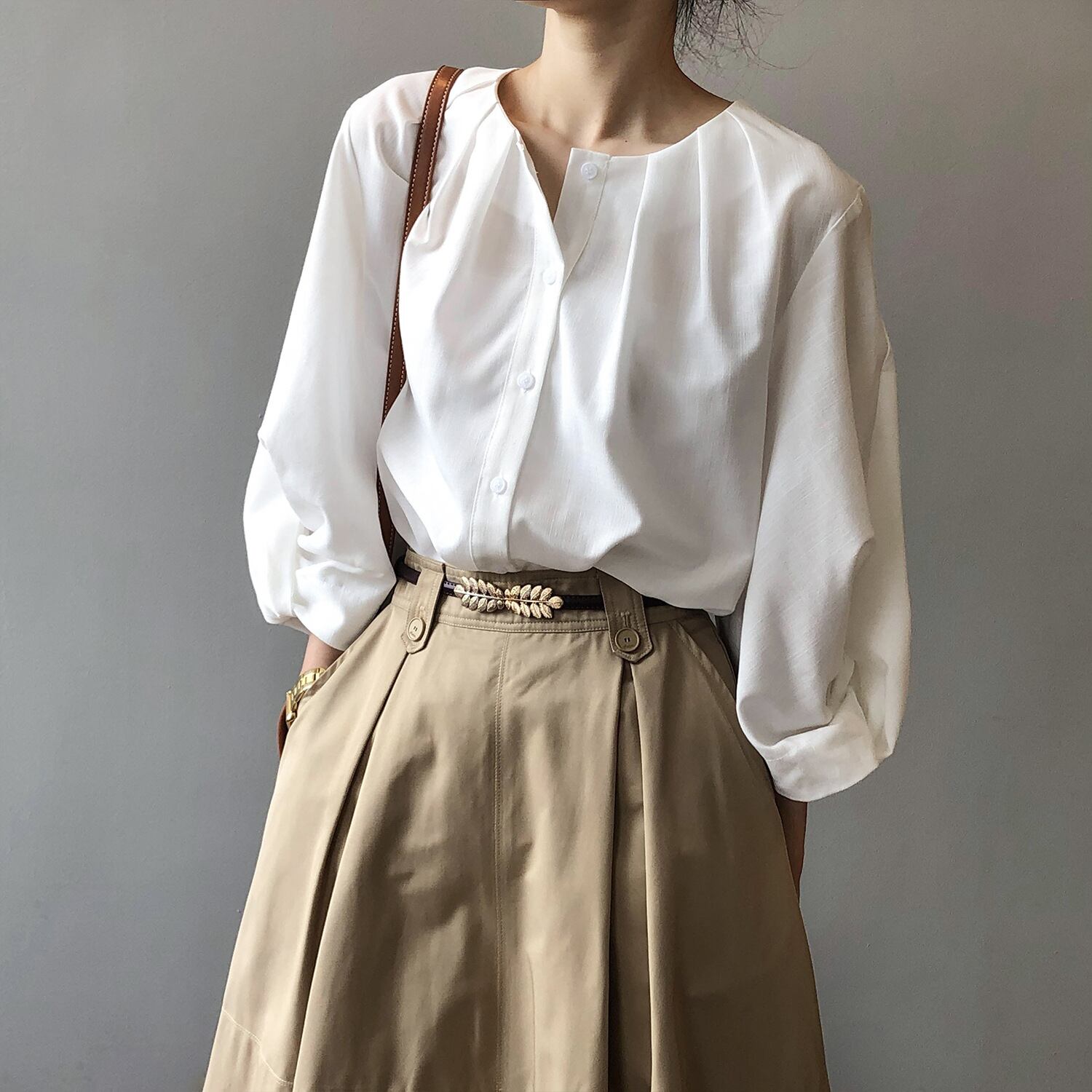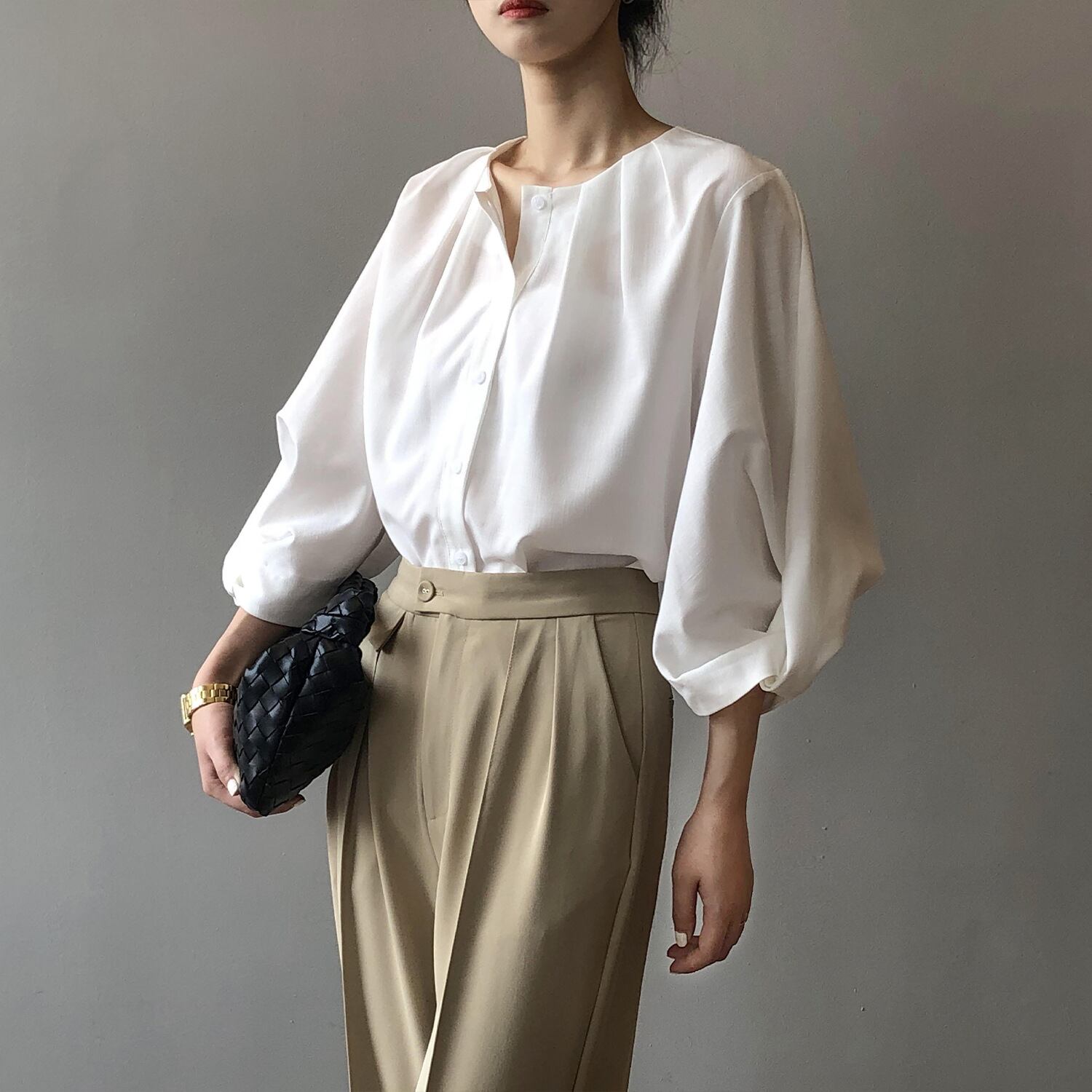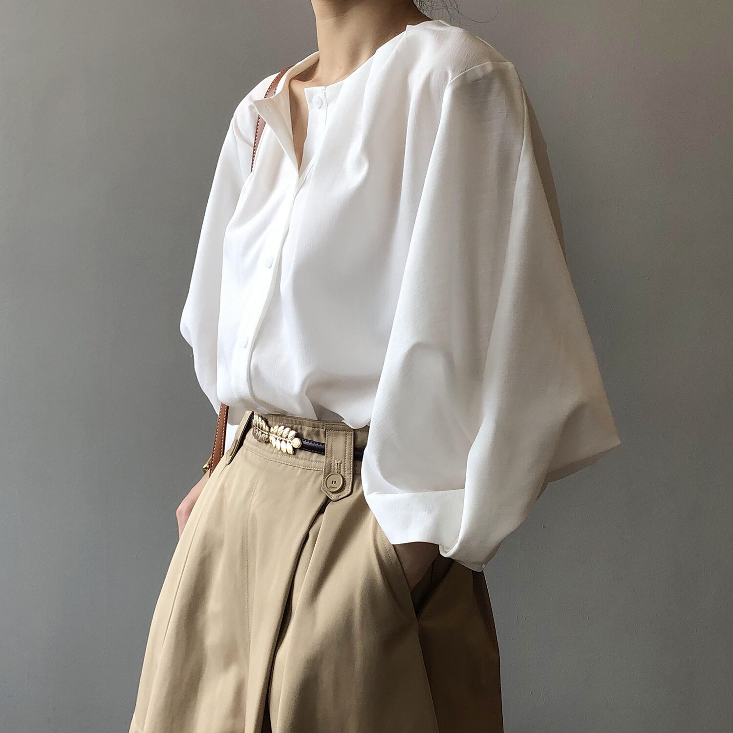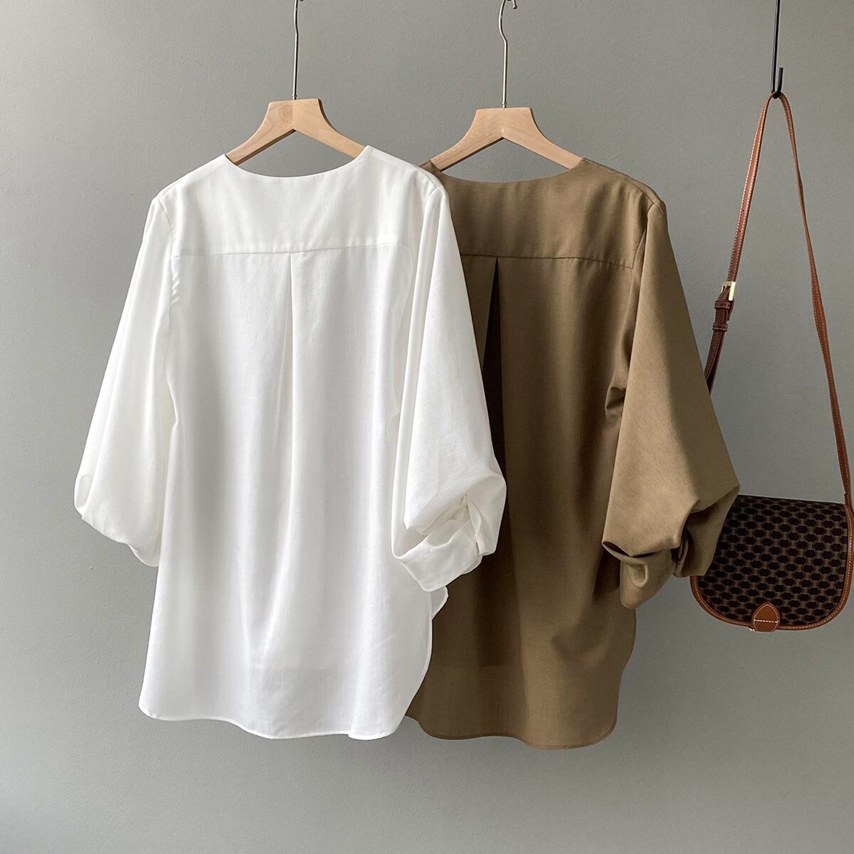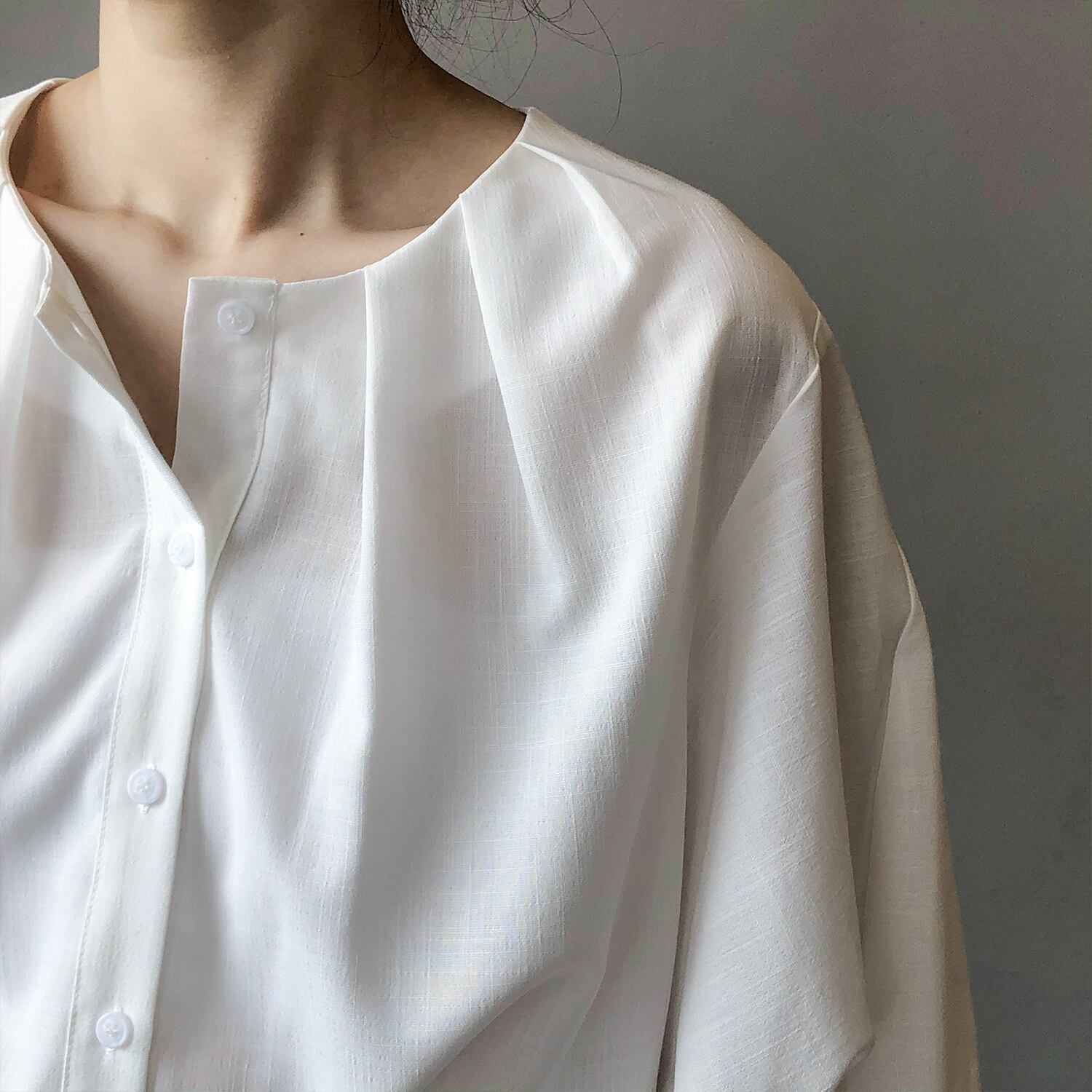 ノーカラーランタンスリーブシャツで、