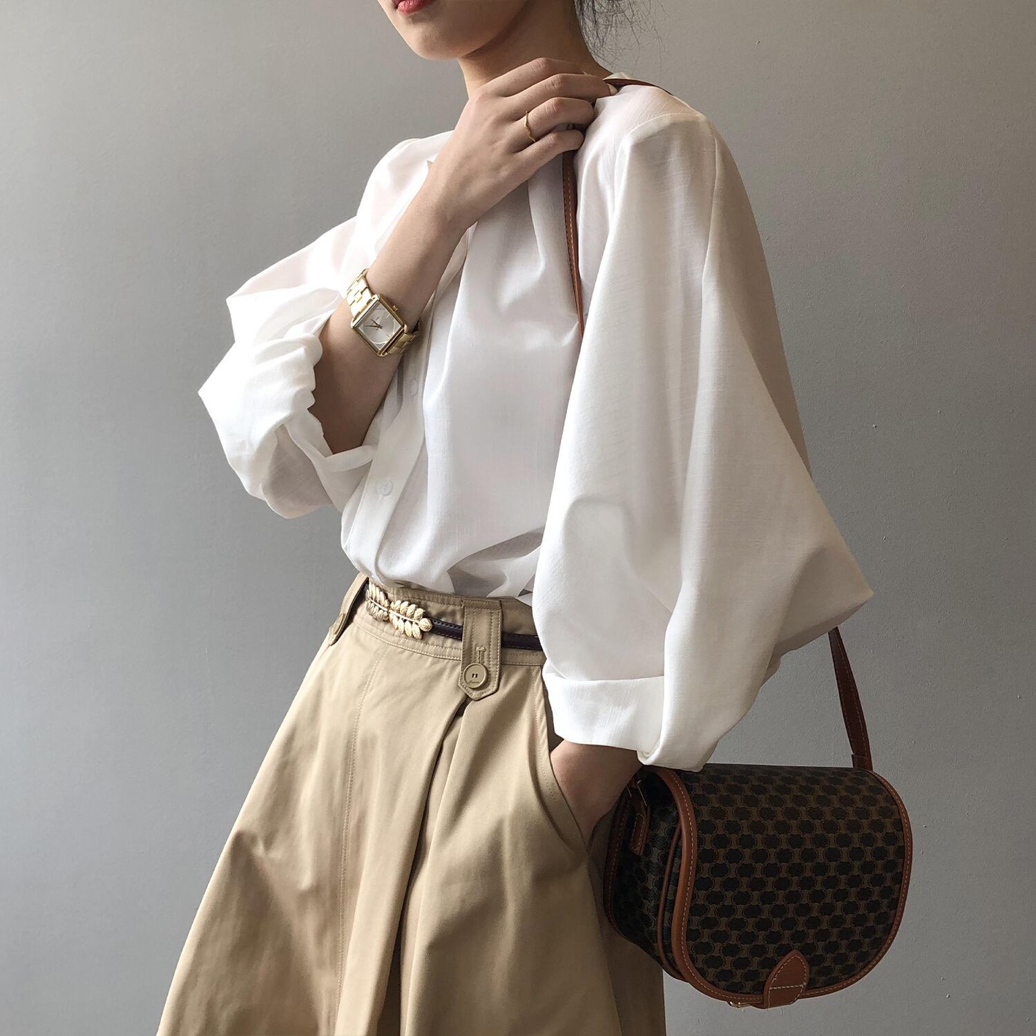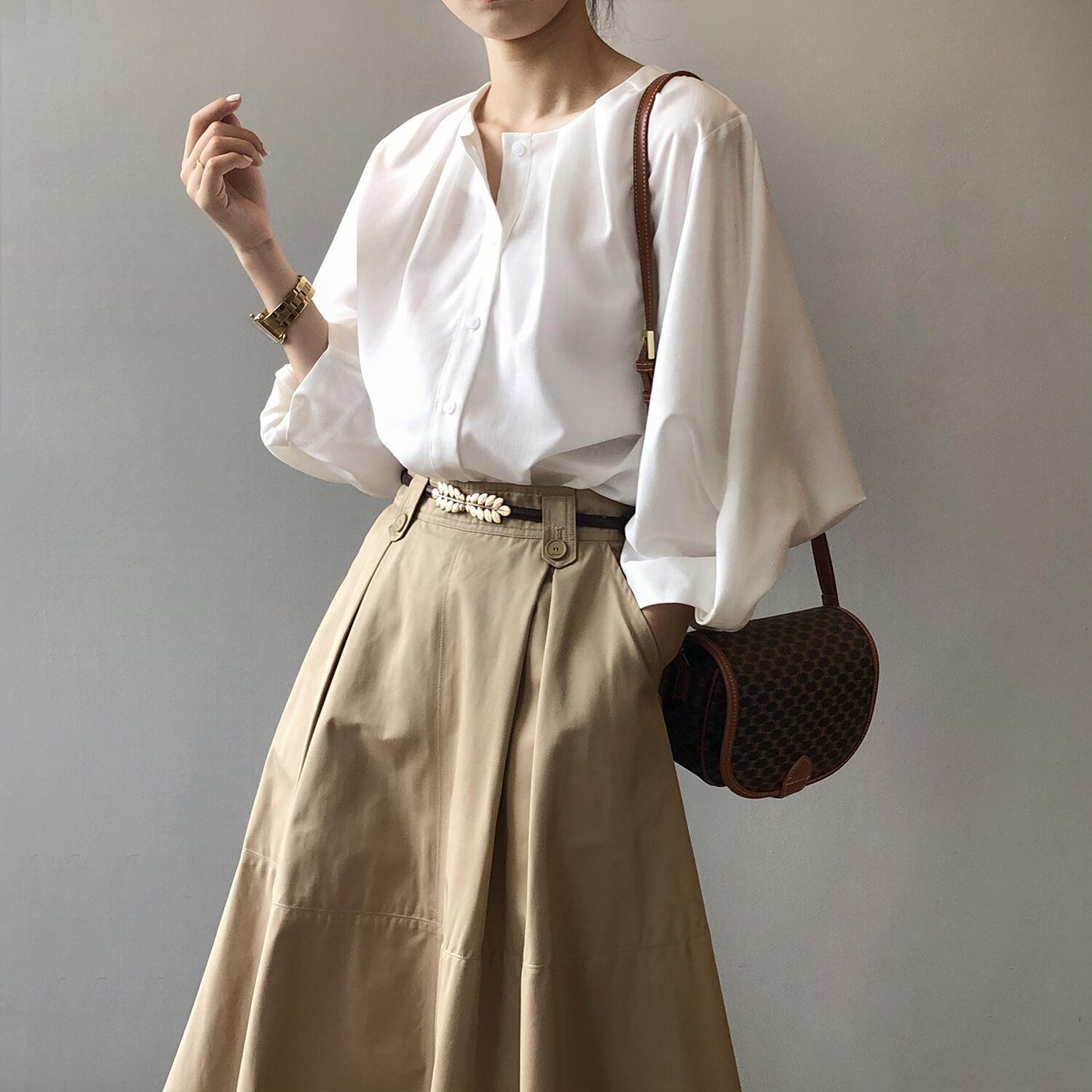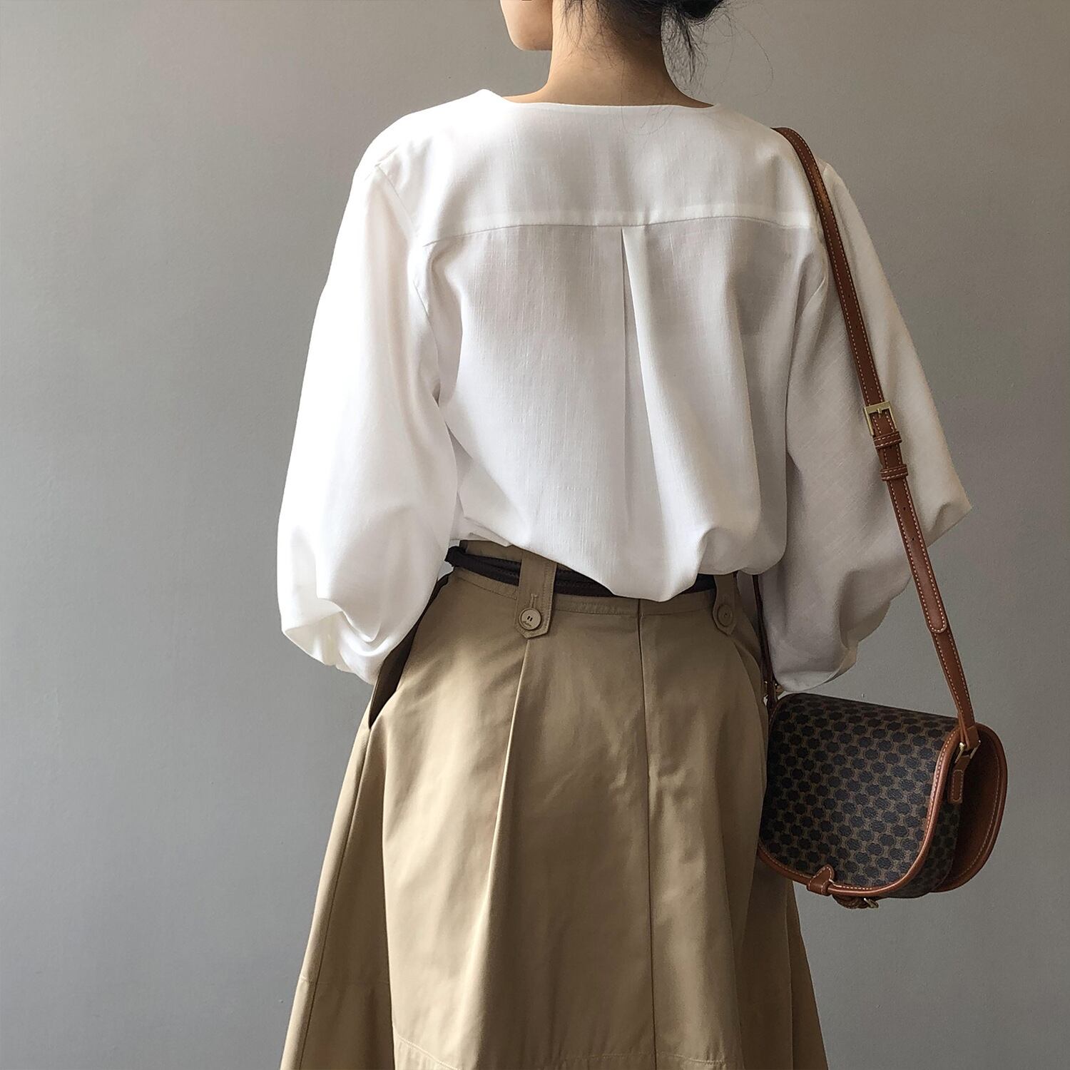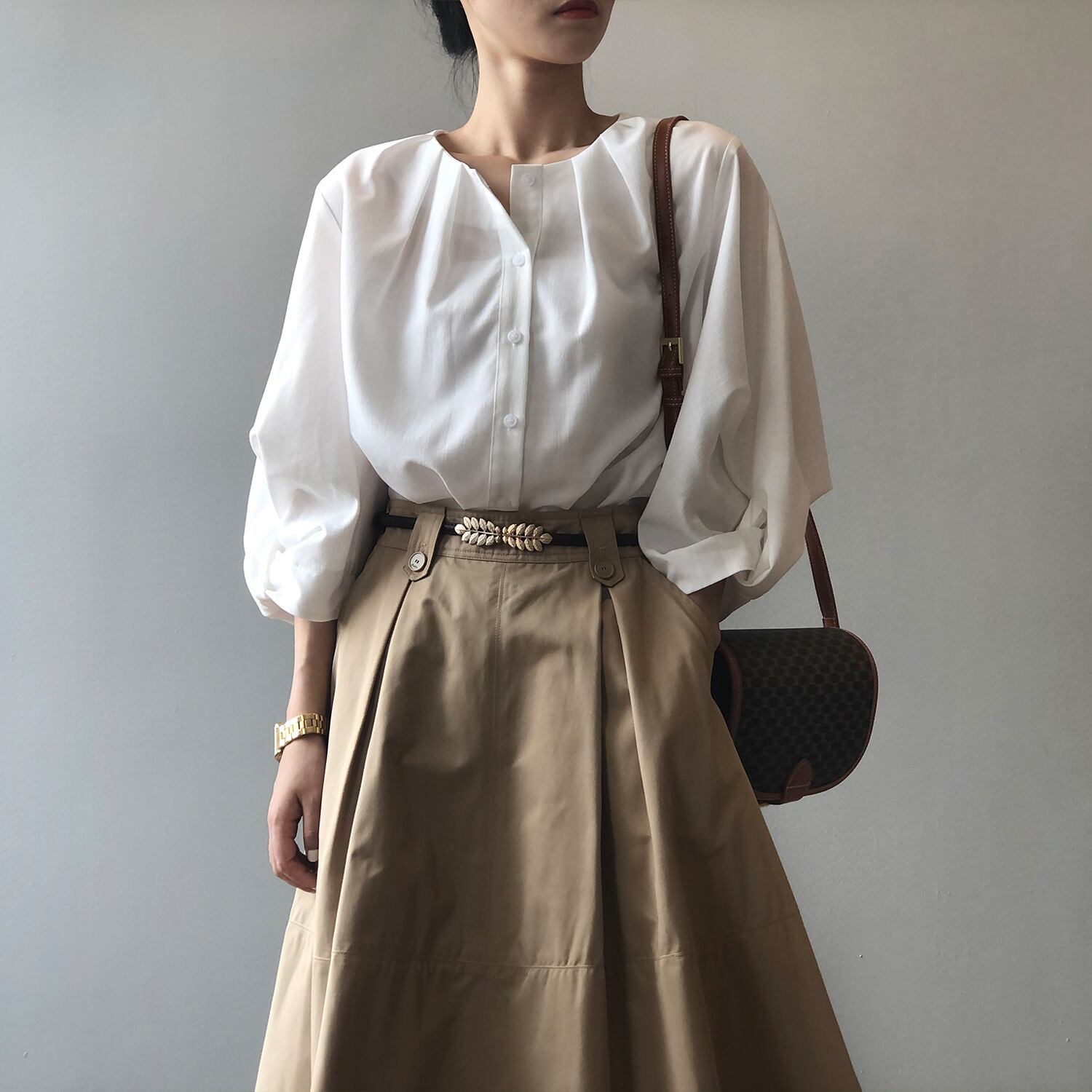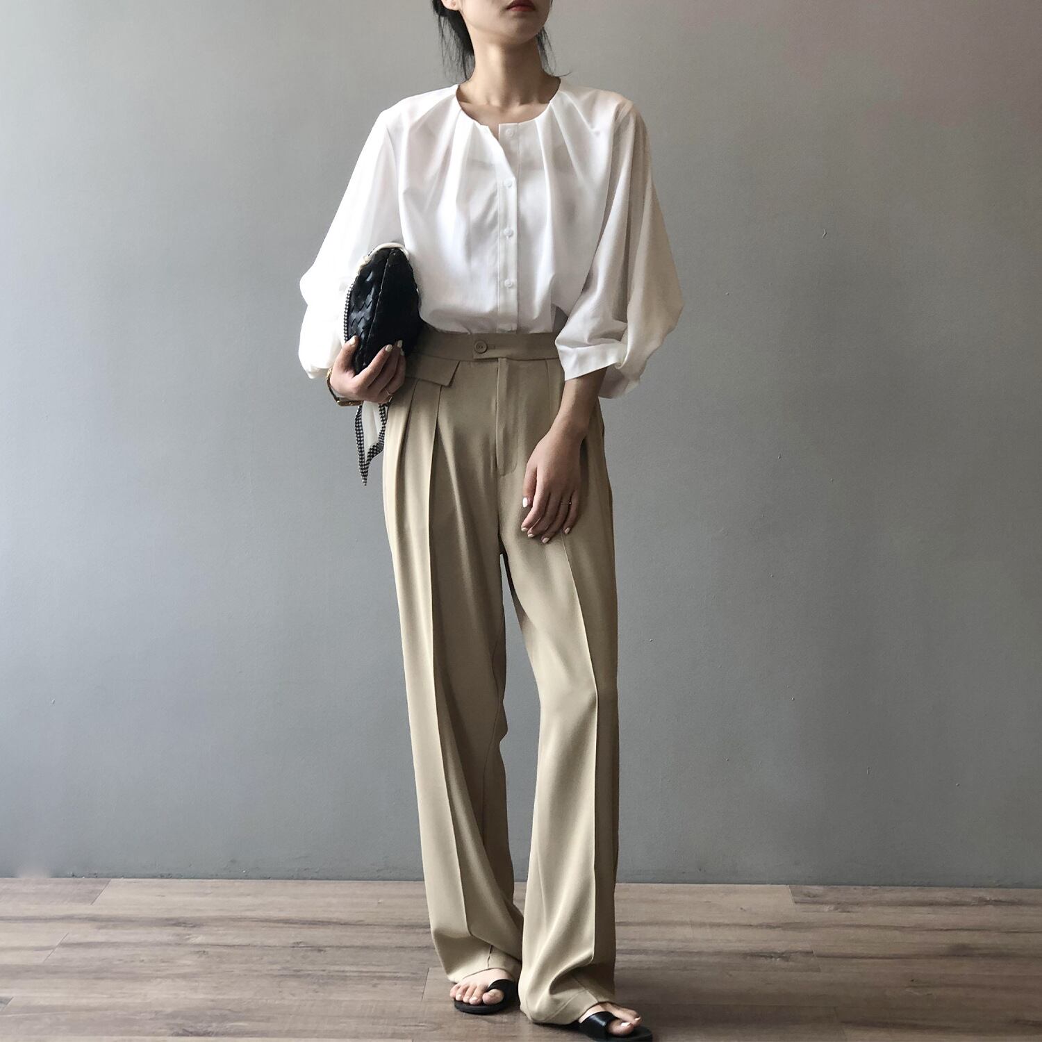 ノーカラーランタンスリーブシャツで、