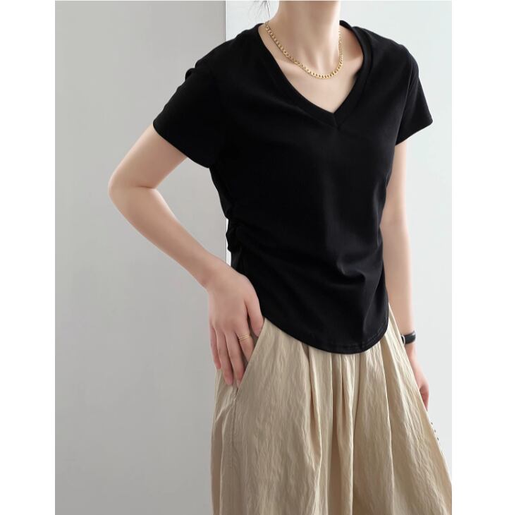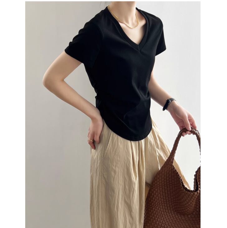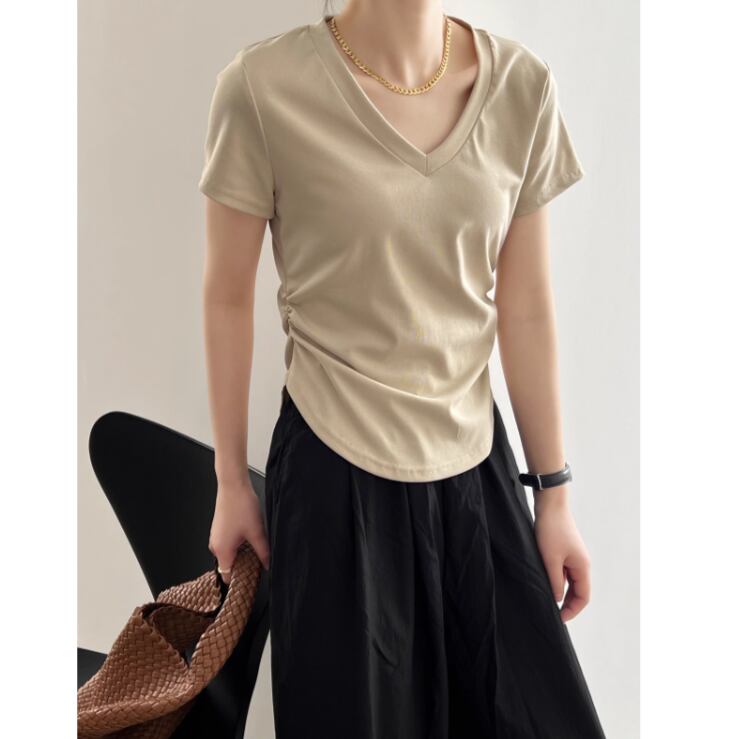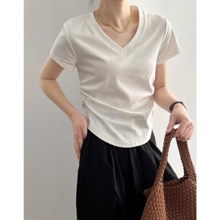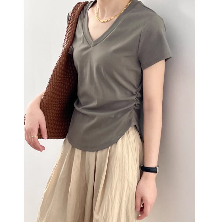 首周りをすっきりと魅せるVネックに サイドのギャザーがウエストラインを きれいなシルエットに魅せてくれる。 シンプルだけどこだわりのある デザインTシャツ。 ◇ size F 〔肩幅:36cm / 胸囲:78cm / 袖丈:13cm / 着丈:50cm〕 *モデル身長160cm、Fサイズ着用 *採寸方法により1~3cmの誤差がある場合がございます。 ◇ color ライトカーキ ホワイト ブラック ライトブラウン オリーブグリーン ◇ material コットン 95% ポリエステル 5% 【重要:ご注意事項】 〈商品について〉 ◇こちらは輸入品となります。日本製とは検品基準が異なる為、新品未使用品でもごくわずかな汚れや ほつれがある場合もございます。 ◇仕入れ工場を変えることがあるため、記載サイズと若干異なる場合がございます。 ◇商品の色味は、お手持ちのスマートフォンの画面によって実物と若干異なる場合がございます。 ◇イメージ違いやサイズ交換等、お客さまご都合による交換、返品は対応出来かねます。 〈 お届けについて〉 ◇こちらの商品は海外店舗より直接発送となる為、ご入金から2週間~4週間前後でお届け致します。 ◇タイミングによっては 商品在庫切れにより注文キャンセルとさせていただく恐れもございますので、予めご了承くださいませ。 ———————————— 商品を購入いただく前にこちらの【ご購入前にこちらをお読みください】を必ずお読みいただき、ご了承の上お買い物いただけますようお願い申し上げます。 ☆ご購入前にこちらをお読みください↓ https://ftera.thebase.in/about ☆Hot Itemはこちら↓ https://www.ftera.shop/categories/4578778 ☆ショップのトップページはこちら↓ https://www.ftera.shop/ ———————————— ◆選べるお支払い方法 以下のお支払い方法をお選びいただけます。 ☑クレジットカード決済(VISA/Master/JCB/AMERICAN EXPRESS) ☑キャリア決済(docomo/au/UQmobile/Softbank/Y!mobile) ☑銀行振込 ☑コンビニ決済・Pay-easy ☑あと払い(Pay ID) ————————————