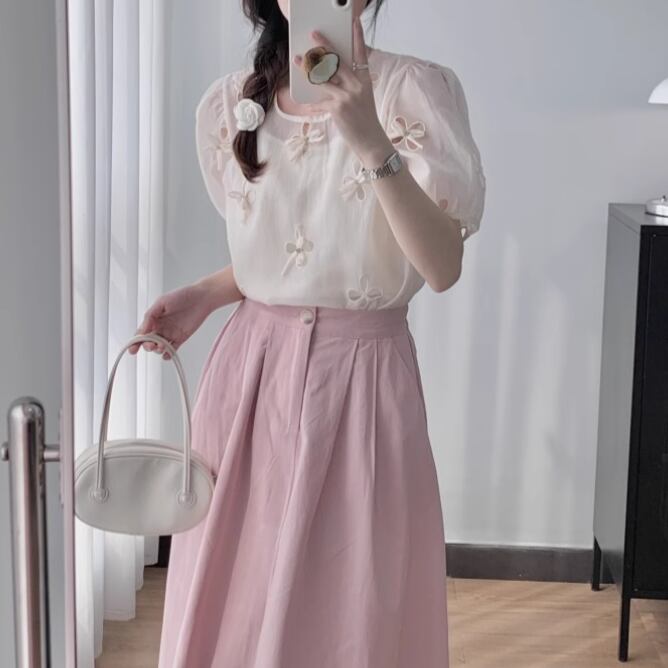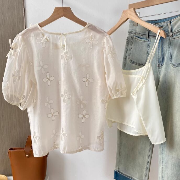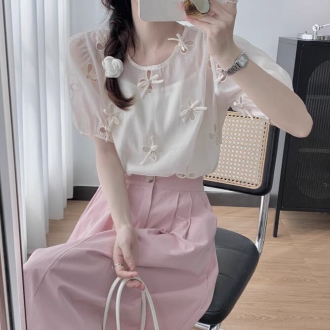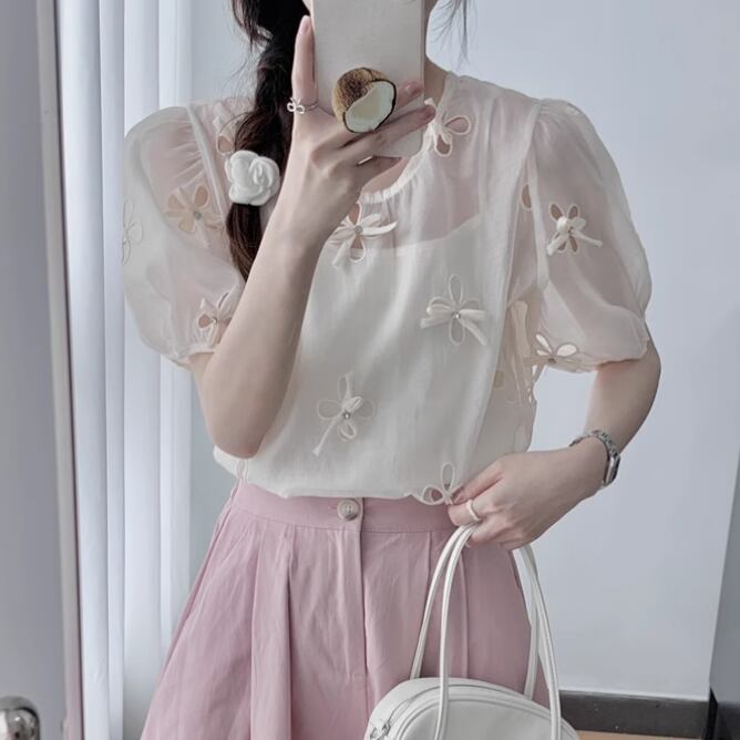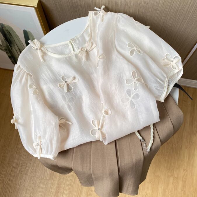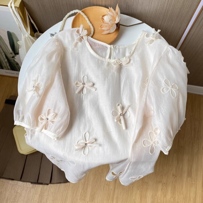 パフスリーブリボンフラワーモチーフシアートップス 00773